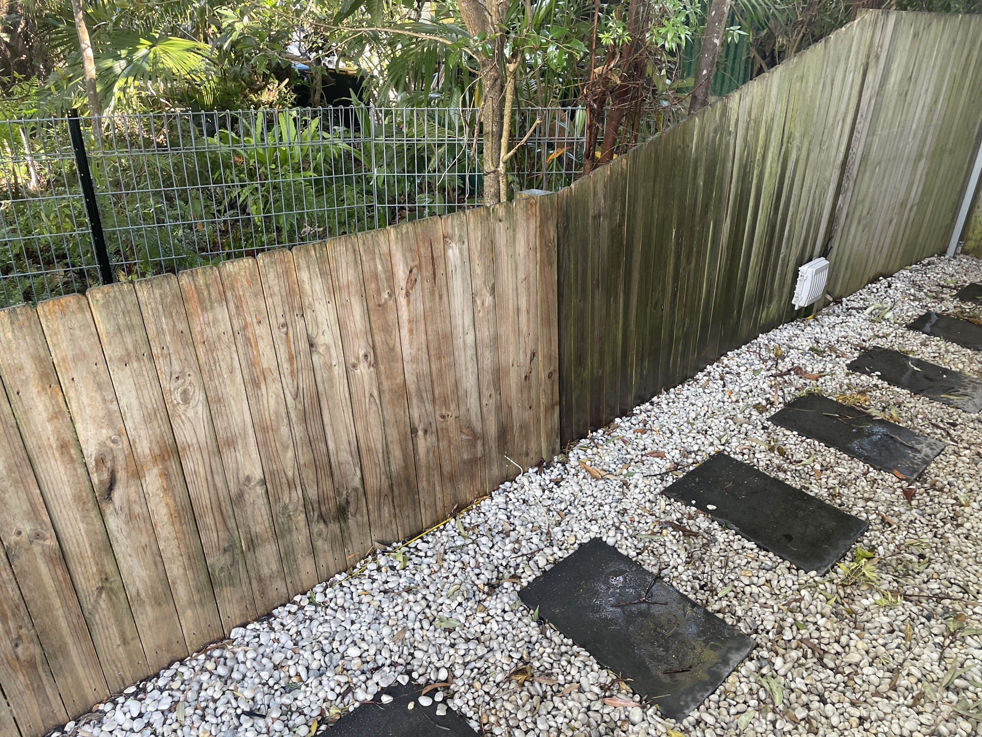 Our soft washing method is ideal for delicate areas, such as painted surfaces, eaves, and fascia, ensuring a thorough clean without stripping paint or damaging materials. For more robust areas like driveways, patios, and retaining walls, our high-pressure cleaning efficiently removes tough stains, moss, and algae, restoring surfaces to their original condition.